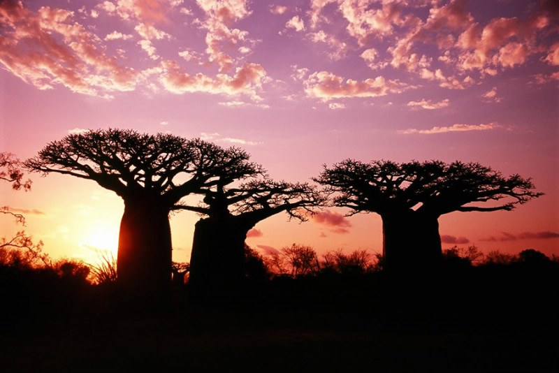 はるばるマダガスカルまで来たからには、この景色を見ずには帰れません。それがモロンダバにあるバオバブの並木道です。並木道といっても人が植えたわけではなく、自生している樹木で樹齢は100年以上。道はあとから人間がつくったものです。天に向かって手をのばしたような形がとっても特徴的。これほどバオバブが立ち並ぶ風景は世界広しと言えども、 ここマダガスカルだけです。 夕暮れどき、バオバブの木々のシルエットの向こうに真っ赤な夕陽が沈む幻想的な風景に、ただただ感動します。朝日が昇る夜明けの時間帯だと他に観光客が誰もいなくておススメです。