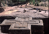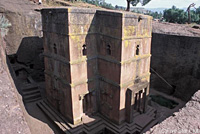 ラリベラにはたくさんの岩窟教会があるが、やはり最高の見ものがこの十字架教会こと「聖ギオルギス教会」である。周りの岩山と十字架の部分が、かつては同じひとつの岩山だったとは信じ難い。奥行きも高さも幅もすべて12mの正十字架形である。外の細い通路を抜けて下に降りると、黄色くこけが生えた石壁には、アクスム様式と呼ばれる均整の取れた美しい窓がある。小さい入り口から中に入ると、内部は柱もない掘り抜きの狭い空間となっている。薄暗くじめじめして、ダニの温床という悪名高き教会内部である。番人の僧侶がただひとり、教会用語のグズ語で書かれた500年も前の古びた聖書を見せてくれた。