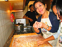 講習メニューはプーリア州の名物、耳たぶ型のもちもちパスタ「オレキエッティ」のトマトソースと、シチュー。熟練技のお母さんが器用に耳たぶパスタを作って見せてくれ、見よう見まねで私たちも作る。意外に難しいものの楽しい体験だ。骨付き肉はオリーブオイル、ニンニク、バジルと農家で採れた自家製トマトのソースをたっぷり使い、ブランデーも入れてじっくり煮込む。