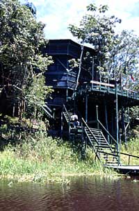 すべてが木造でモスグリーンに塗られた「ジャングル・タワー」は森の緑の中に見事に同化しているユニークなホテルだ。地上30メートルもの高床式の建物が空中の渡り廊下でつながり、自分がサーカスの綱渡り師にでもなったみたいでスリル満点。どこにいてもジャングルと川の風景を見渡せるのがすばらしい。