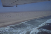 帰り道は約束通り、スケルトンコースト上空をロベルトさんは飛んでくれた。白く波立つ海岸に迫る荒野。砂漠のデューンまでは見えないが、低空飛行で味わうコーストラインは、セスナのダダダダ・・・・という音と相まってとてもワイルド。ここにコロニアルピンクのフラミンゴの大群が驚いて飛び立ち赤い羽根を見せつつ広がっていく・・・という図があれば、本当に鳥肌モノなのだが・・・あいにく今回はフラミンゴはどこかへ行ってしまったようで、1羽たりとも姿を見せてはくれなかった。