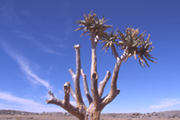 スワコプムントに1泊後、よく朝8時ホテル出発。ミニバンをたくましく運転してくれるキャロリーヌさんとの旅が再開した。一路南へ南へ。年中霧がかかったように曇って肌寒いスワコプムントの町を抜けて3時間も走ると、大自然のまっただなかに自分がいることに私は気付いた。一面に広がる荒原におもしろい形の木が生えている。コッカーブームと呼ばれるアロエの木だ。乾燥し切った太い幹の皮はめくれ、上の方に可愛いアロエの葉が生えている。ブッシュマンが弓矢を作る木だそうだ。ナミビアには多種のアロエが存在するようで、1冊の図鑑があるほど、その種類は多い。