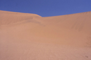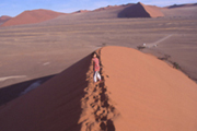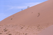 両側が急斜面で、滑り落ちそうな気がして結構スリルがある。120メートルまで登るとけっこう疲れた。もうひとつの頂上まで登ると140メートルらしいが、まあこの辺で十分だろう。あたりの風景、デューンの赤い色はちょうどオーストラリアのエアーズロックのようだ。砂漠が岩なら・・・・