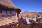 そんな砂漠の片隅にあって、ワイルダネス・ロッジの回りのブッシュにはオリックスやスプリングボック、ダチョウなどが走りまわっている。平原を見下ろす山の上に9つだけのバンガローがちょうどよい間隔で並ぶ。