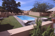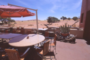 ユニークなロケーションはもとより、すべてがナチュラル素材で作られたバンガローのセンスのよさに脱帽である。レンガや岩、木とかやぶき屋根。ゆったりと広いコテージは大きなガラス張りでワイドなパノラマがとても嬉しい。きれいな白い蚊帳のついたベッドのリネン類の色柄のおしゃれなこと!洗面所のモスグリーンの陶製のシンクに、動物をモチーフにしたレリーフの付いた真鍮の縁の付いた鏡。プチプレゼントみたいにリボンが掛けられた石鹸やわら紐で結ばれた紺色のタオル。コロニアル風の赤い木を基調にしたシャワールームも、バスタブこそないが、たっぷりのお湯が出る気持ちいいシャワーで、眺めが最高のシャワータイムが過ごせる。セミオープンのプライベートプールが付いていて、岩に囲まれちょっと専用露天風呂風。水が冷たくて入れなかったのが残念。これが熱いお湯なら展望風呂そのものだったのに・・・砂漠の近くだから、何が出ても不思議じゃないとは覚悟していたが、予想通りクローゼットに2匹の中くらいのクモがいたのもご愛嬌か。