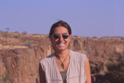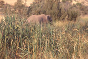 ガイドのキャロリーヌさんの呼ぶ声がした。大声を出すと象が逃げてしまうのでそっと近づいて行く。ちょうどロッジの敷地のすぐ外の木のところに1頭、これこそ本物の砂漠の象である。こんなにロッジの近くまで象が遊びに来るとは驚きだが、他のゲストいわく、夕べは12頭の象が集団で遊びに来ていたそうだ。