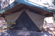 ロッジはシンプルながら、快適で、テントの窓から見える風景は絵のようにすばらしい。ファスナーで開閉する窓、扉、そしてレンが造りといった取り合わせが特徴的だ。ホットシャワーは出るし、エアコンはなく扇風機だけだが、部屋には蚊もいなくて、居心地はいい。