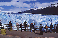 世界にはさまざまな氷河が存在するが、目の前で頻繁に崩れ落ちる興奮を味わえるのはここペリト・モレノが最高であろう。皆、展望台からズームレンズのカメラを向けて、固唾を呑んで崩落が起こるのを見守っている。小さいものでも音はかなり大きいのだが、一度だけ前面の特大の氷塊が崩れ落ちたのにはびっくりであった。その音たるや鳥肌が立つほどの迫力で、崩れ落ちた後の壁面は刃物でスパッと切り落としたかのようにツルリとした濃紺の断面が姿を見せた。ずっと昔の氷が今目の前で、最後の時を迎えているのだ。新たな感動であった。