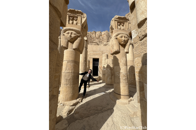 アブシンベル神殿の隣に建造された小神殿でも、ハトホル女神の顔を冠したハトホル柱や、王と王妃が捧げものをするレリーフを見られます。