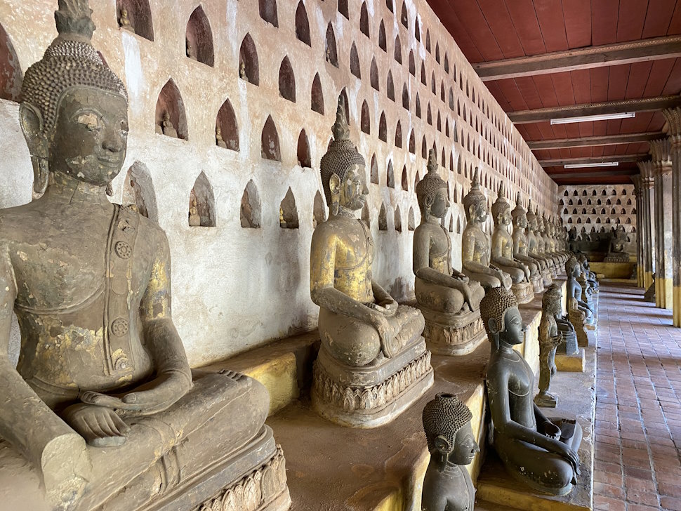 あと中心部で見ておきたいお寺が3か所あります。1つはワット・シーサケート。市内中心部にある16世紀からの建物が残る寺院です。ここでは回廊の小さな穴に並ぶ沢山の仏像達に注目、一体一体に人々の思いが籠っているいると思うと信仰の篤さを感じます。