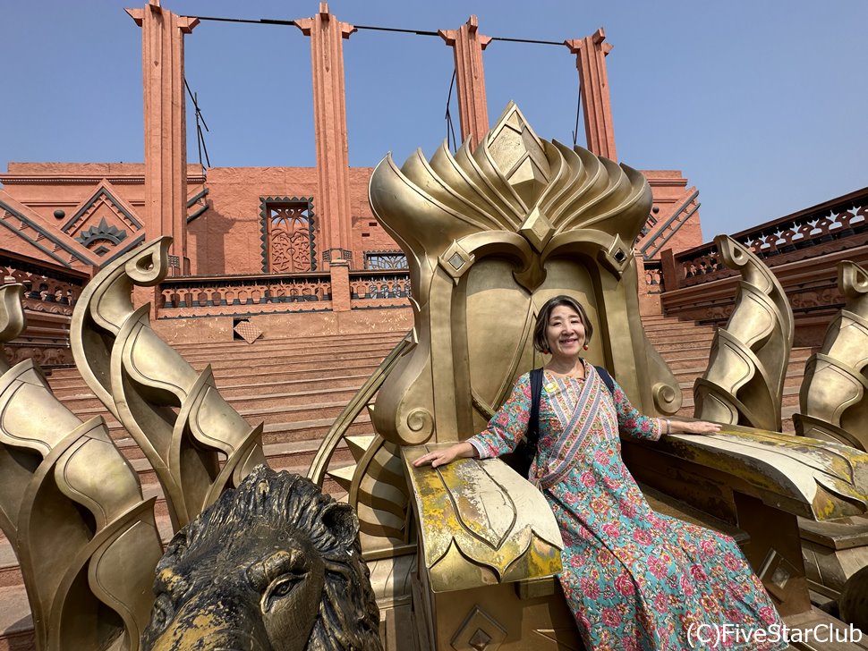 一番人気の映画「バーフバリ」のセットに向かいます。巨大な馬のセットなど見覚えのあるシーンの舞台が目の前に広がり、大興奮。セットの前に立って記念撮影。臨場感あふれるショットが撮れるのです。