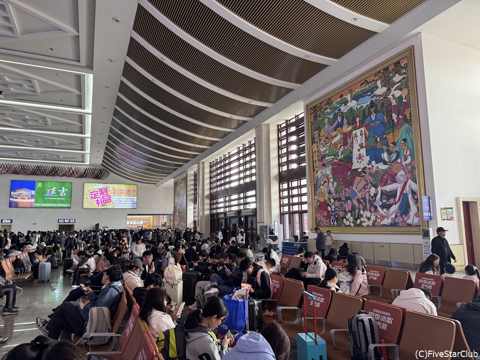 朝鮮風の壁画が掛かっている延吉西駅待合室
