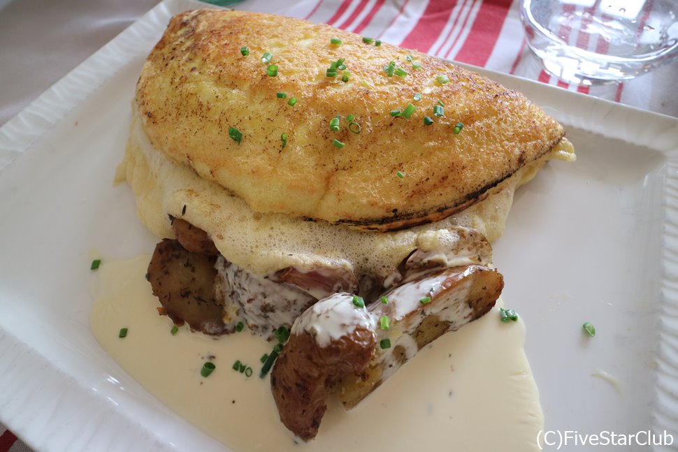 口の中でとろ~んと溶ける口当たりが特徴のスフレオムレツは、歯がいらないくらいフワッフワなんです。卵を3つも使用しているので見た目は驚くほど大きいですが、ぺろりと食べられちゃいます♪味はあっさりとしているので、付け合わせの野菜と一緒に食べたり、塩やケチャップなどの調味料をかけてお好みの味付けを楽しんでください!