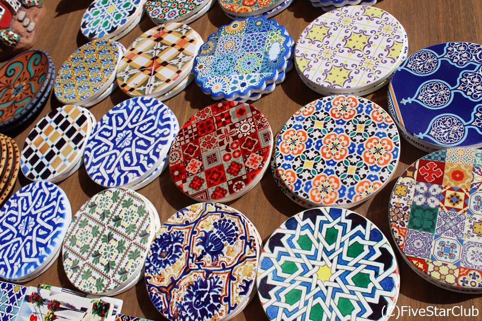 8世紀の初めから約800年間に渡りイスラム教徒により支配されたアンダルシア地方には、コルドバのメスキータやグラナダのアルハンブラ宮殿などイスラム時代の遺産が数多く残っており、スペインのお洒落なお土産店でもイスラムを思わせるタイルが多くみつかります。同じイスラム柄でもトルコやウズベキスタン、イランなどで販売しているタイルとは地域により色・技法が少し異なり、スペインで買うタイルはなんだかとても明るくて華やかなイメージ。キッチンのリフォーム用に少し多めに買い付けるのも良いですし、コースターとしてカジュアルに使用することも出来ます。