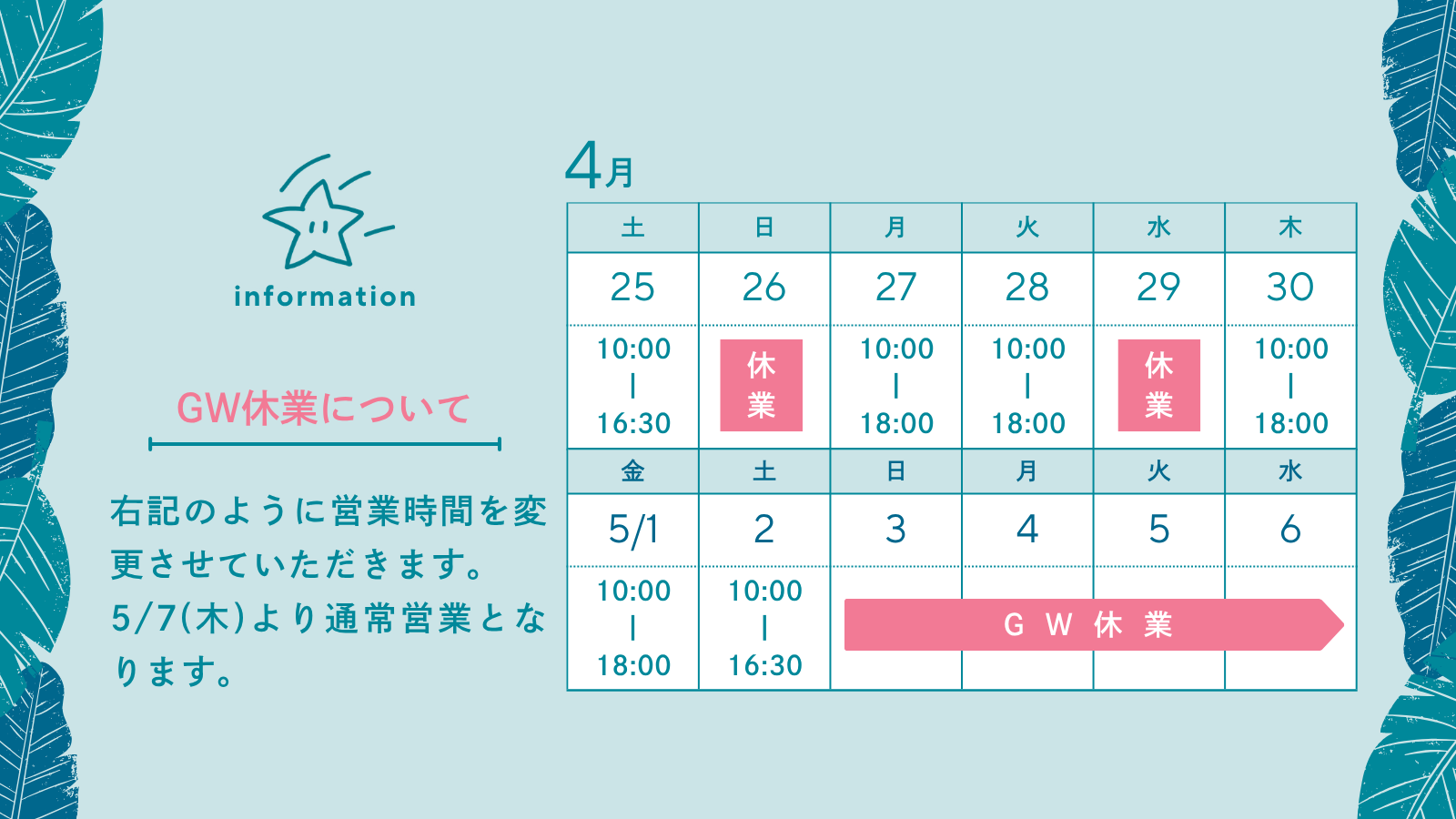 2026年4月30日(木)~5月1日(金)10:00~18:00 【通常営業】